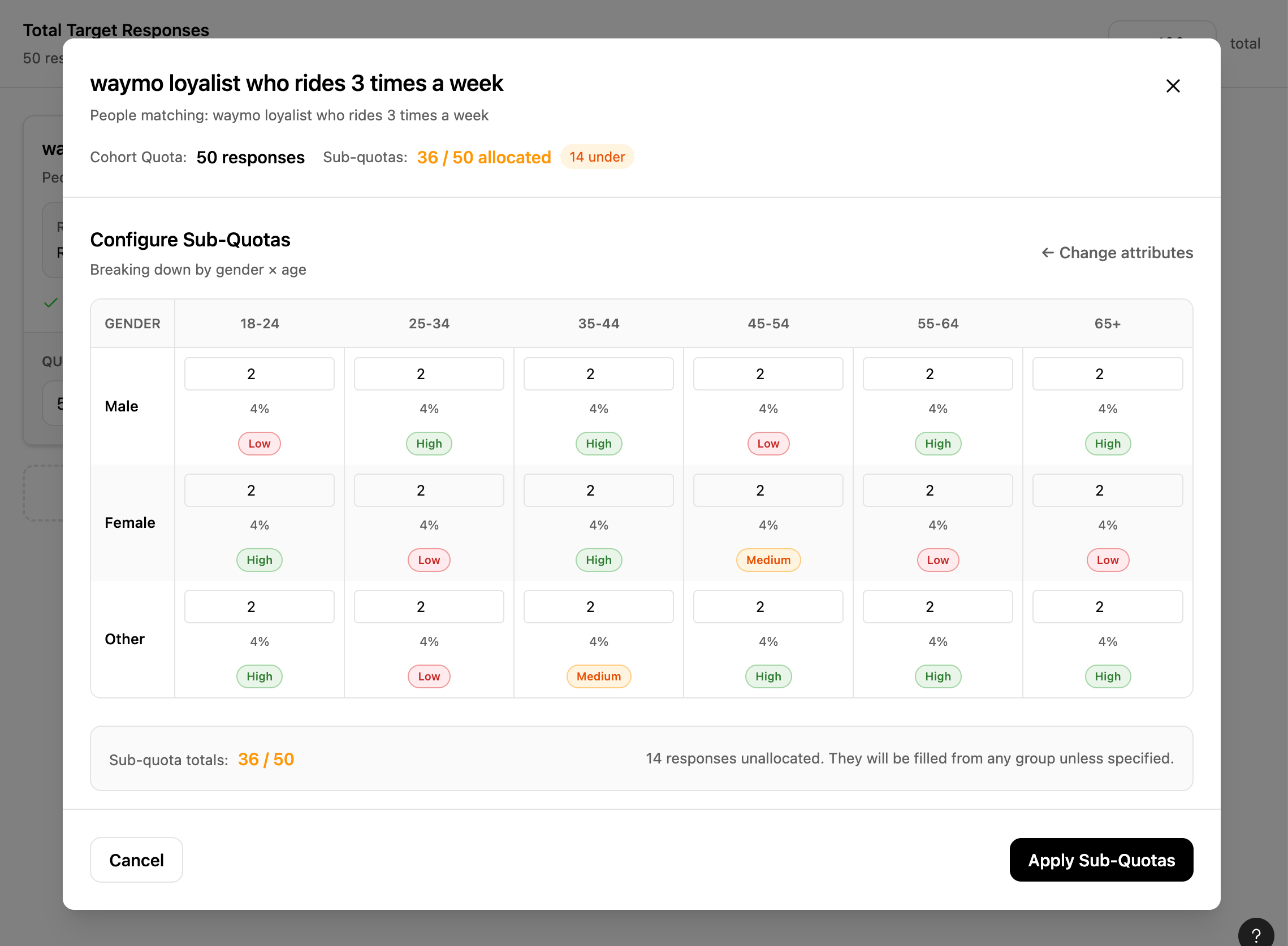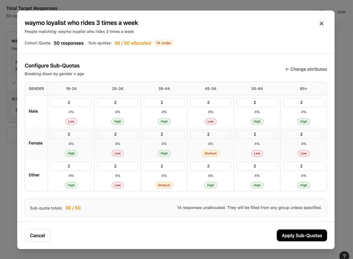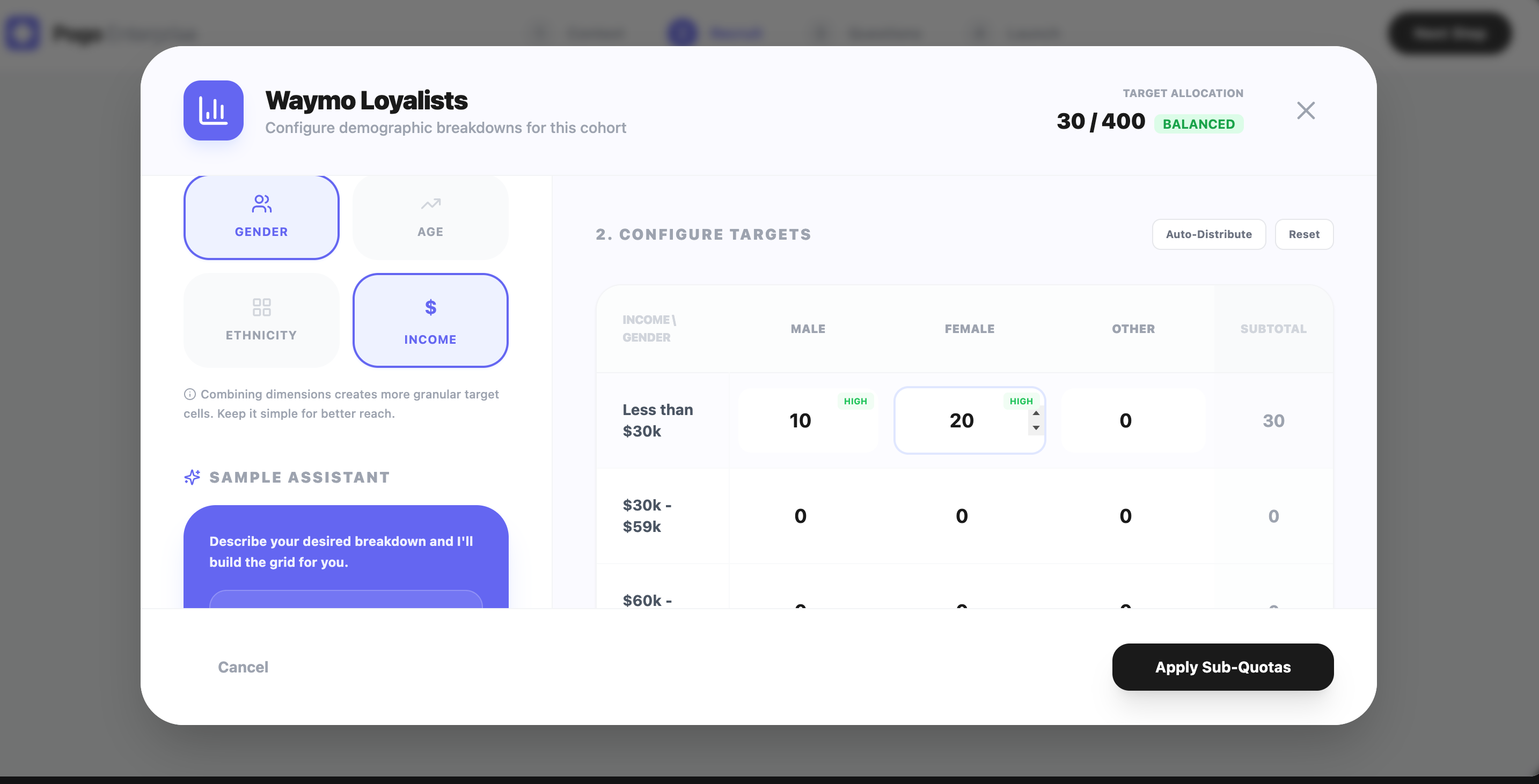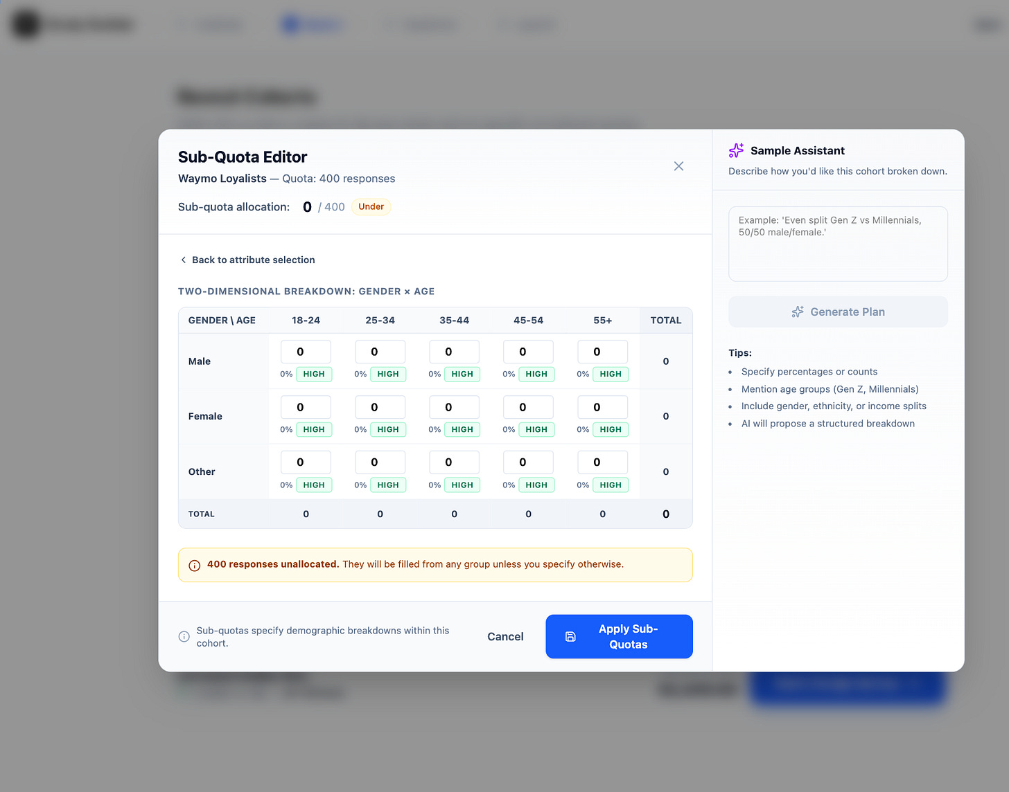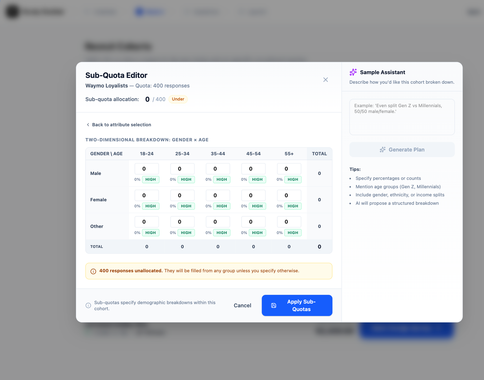 “Oh, so when Alex sets 60 Uber / 30 Lyft / 10 Waymo, that’s at the cohort level. And if he wants 50/50 gender in each, he does that inside each cohort as sub‑quotas. Any leftover unassigned responses get auto‑allocated from eligible participants. Is that correct?”