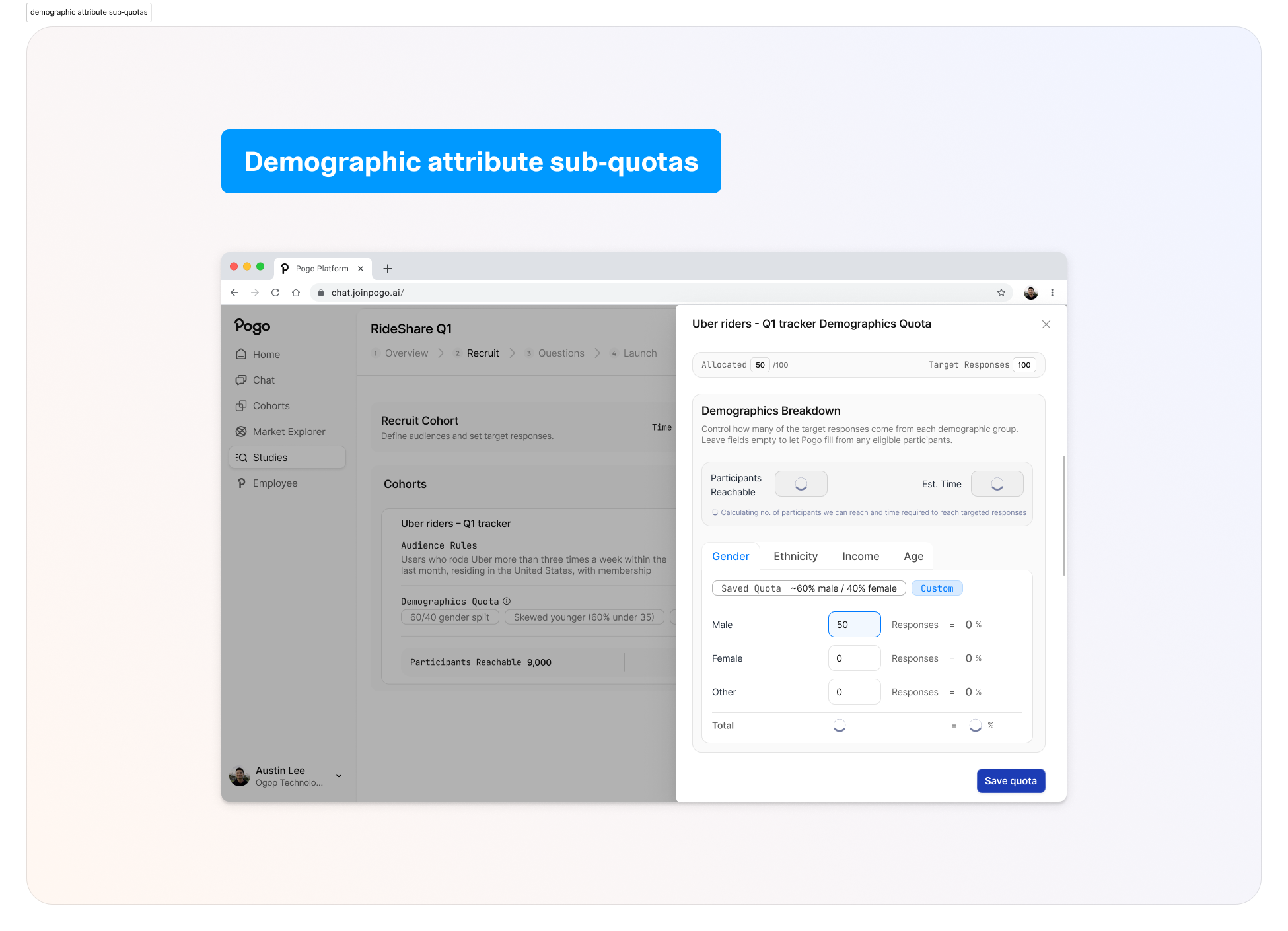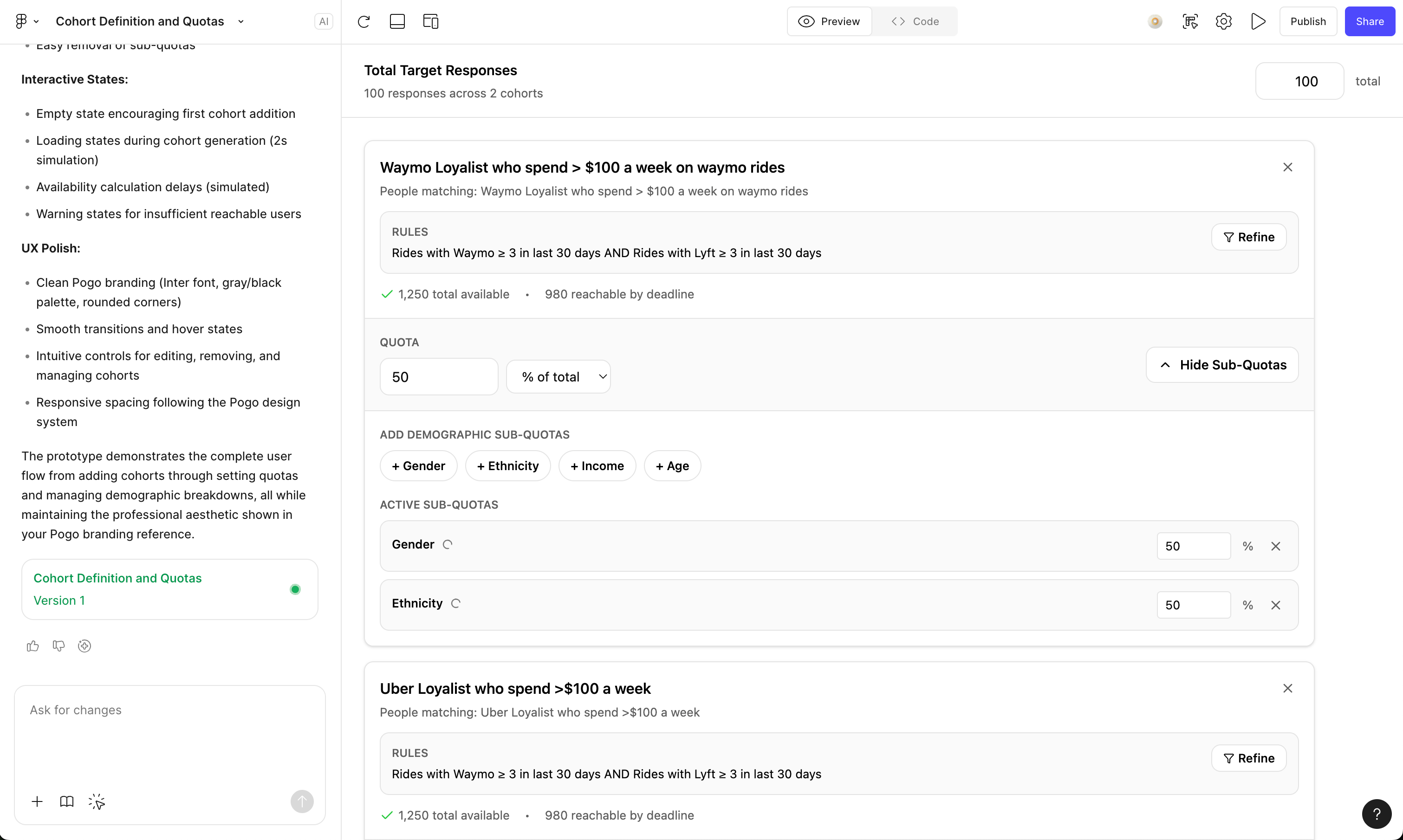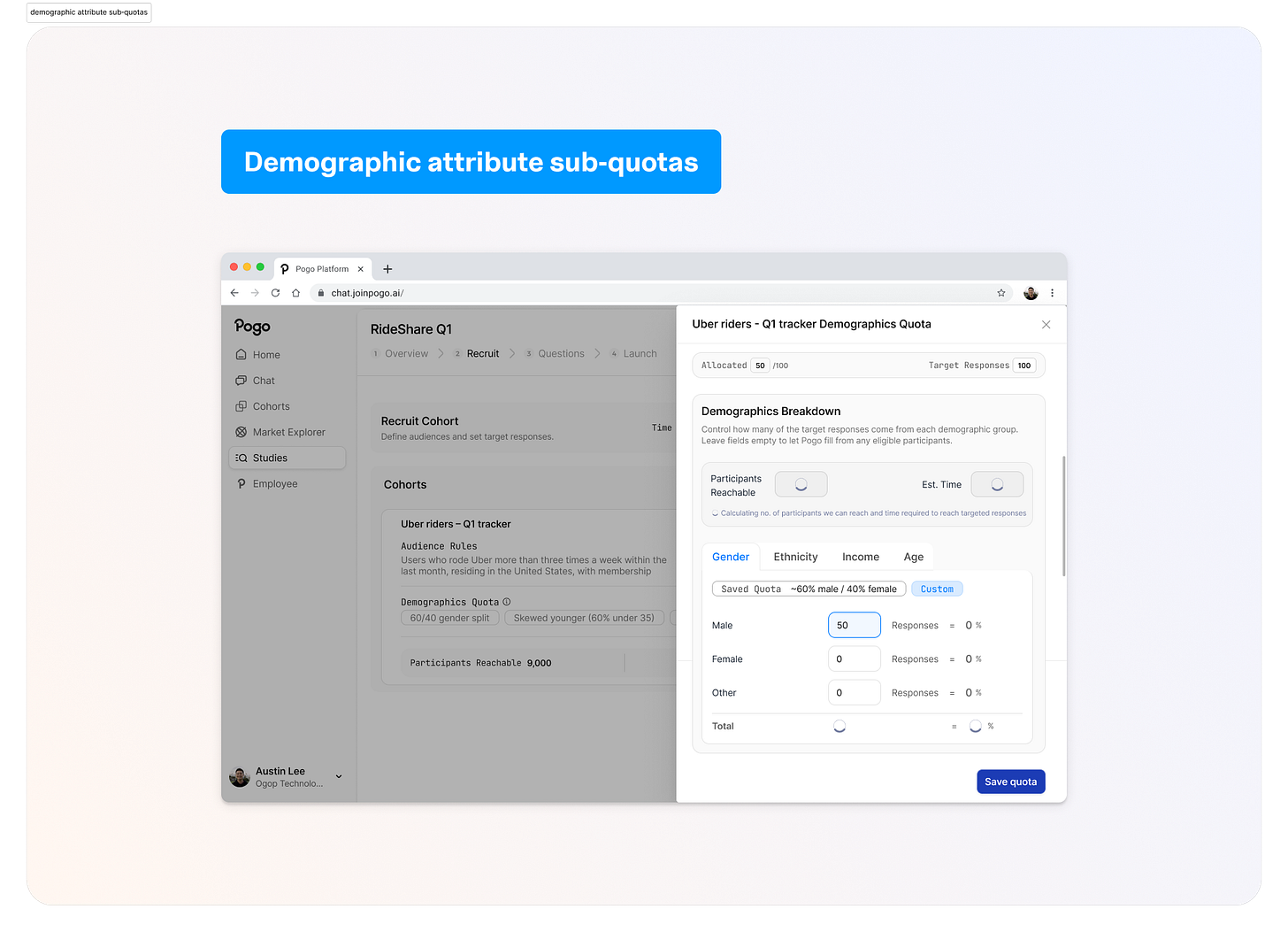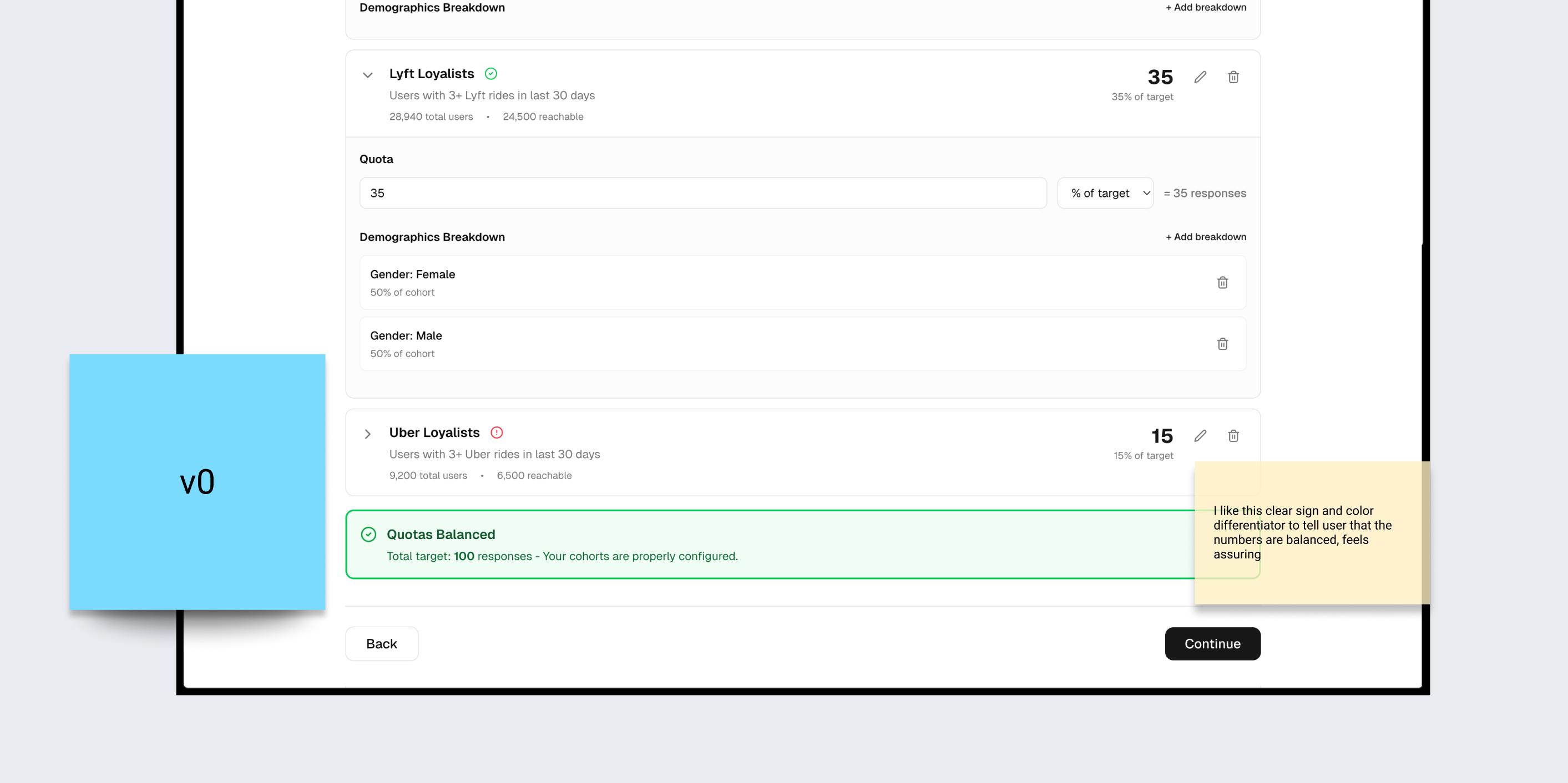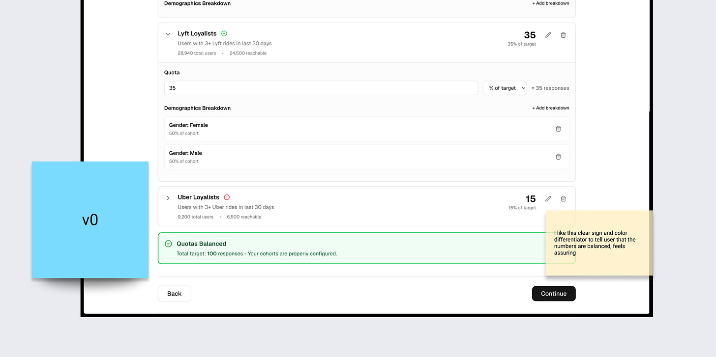 “Oh, so when Alex sets 60 Uber / 30 Lyft / 10 Waymo, that’s at the cohort level. And if he wants 50/50 gender in each, he does that inside each cohort as sub‑quotas. Any leftover unassigned responses get auto‑allocated from eligible participants. Is that correct?”