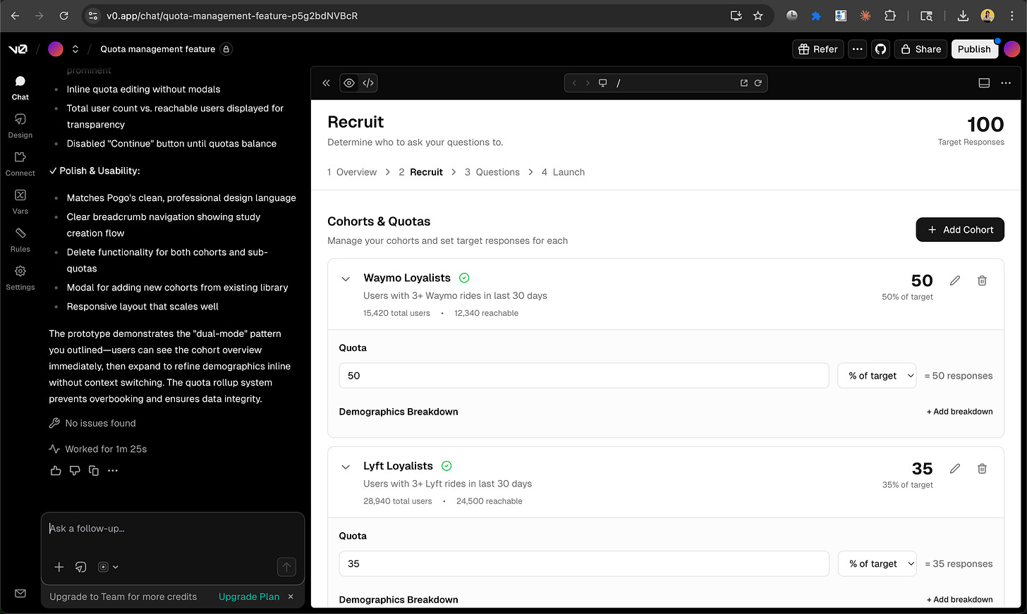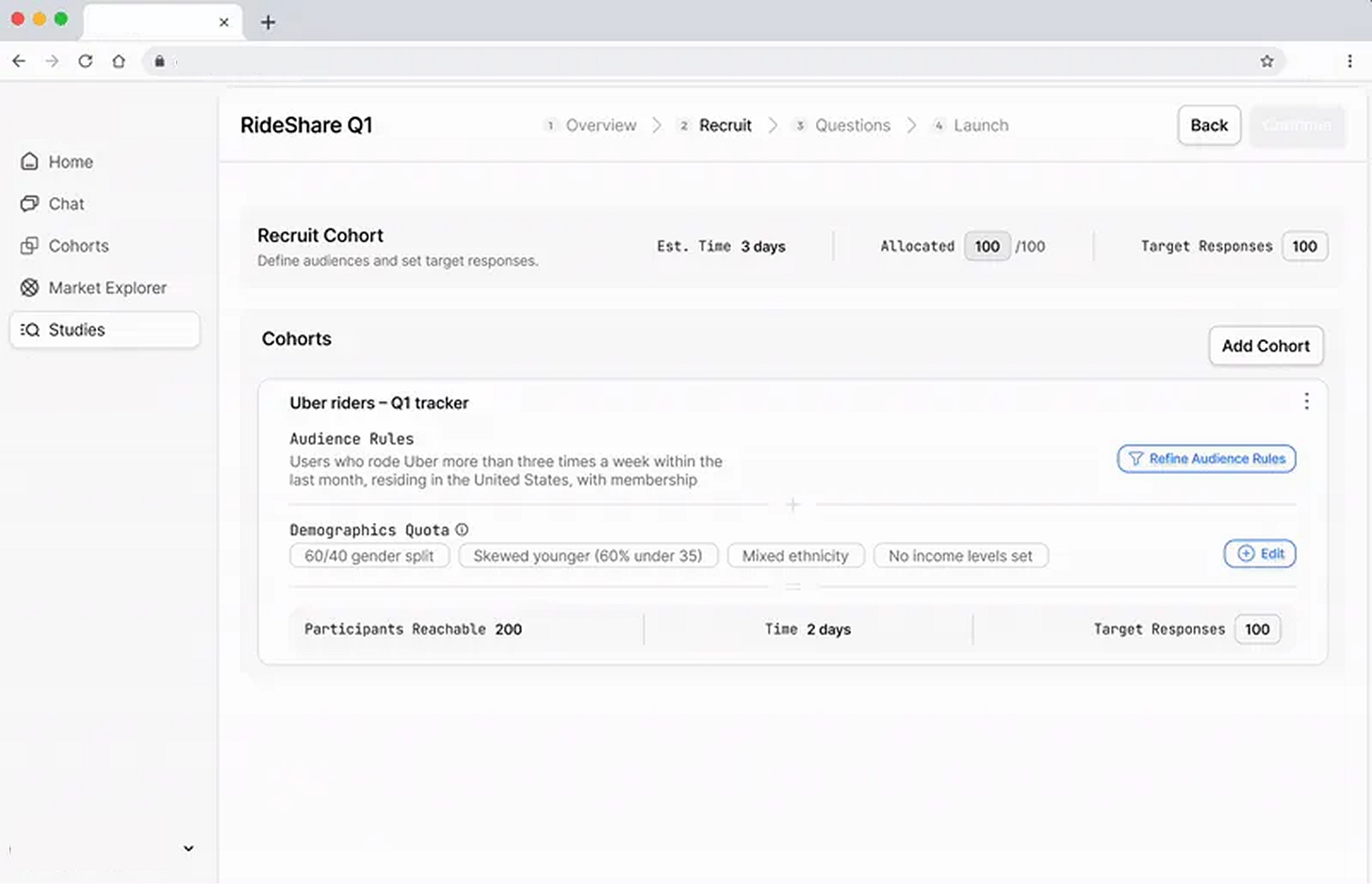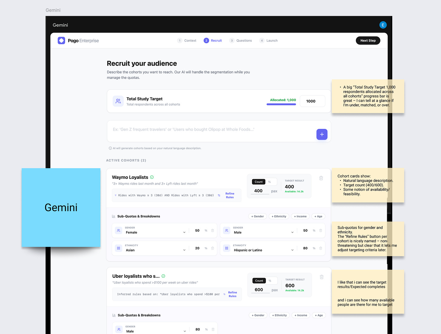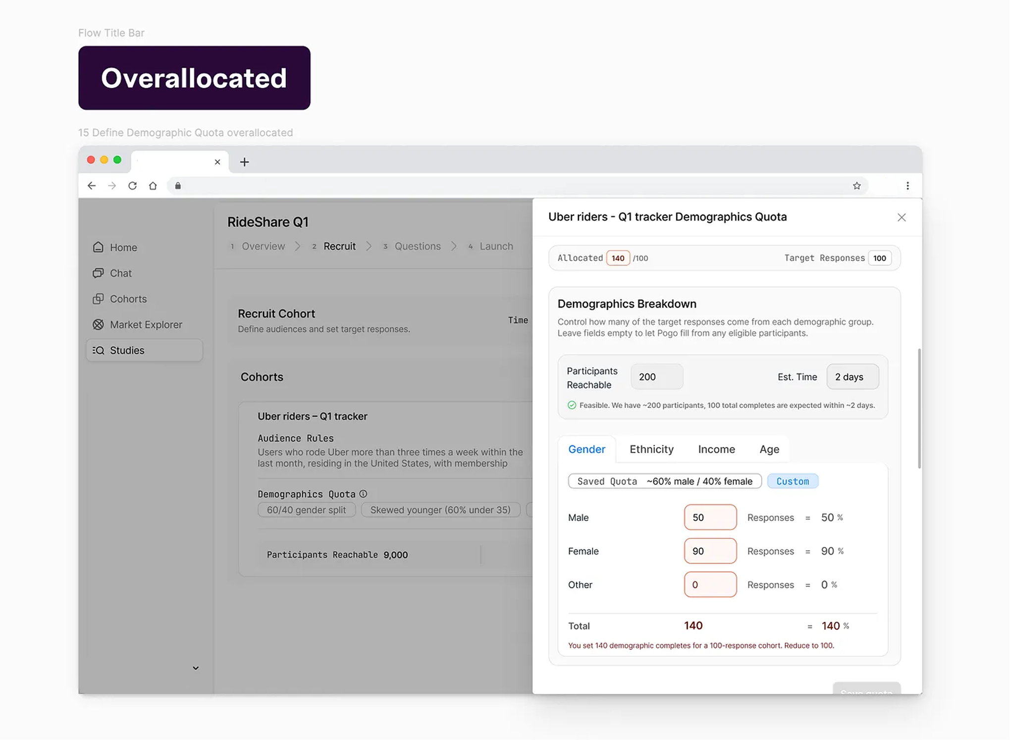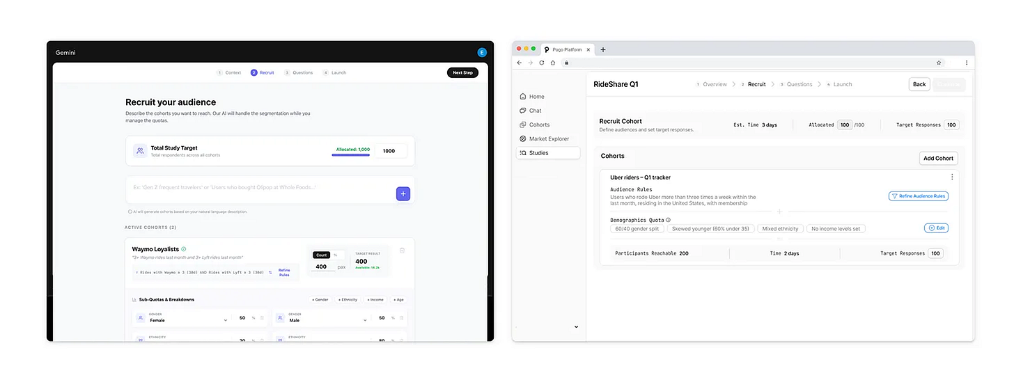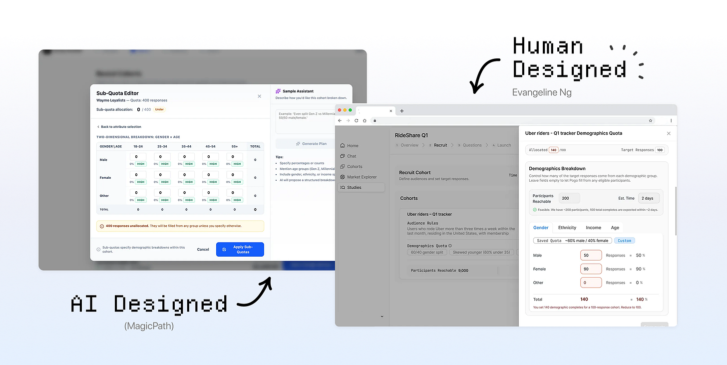 “Oh, so when Alex sets 60 Uber / 30 Lyft / 10 Waymo, that’s at the cohort level. And if he wants 50/50 gender in each, he does that inside each cohort as sub‑quotas. Any leftover unassigned responses get auto‑allocated from eligible participants. Is that correct?”