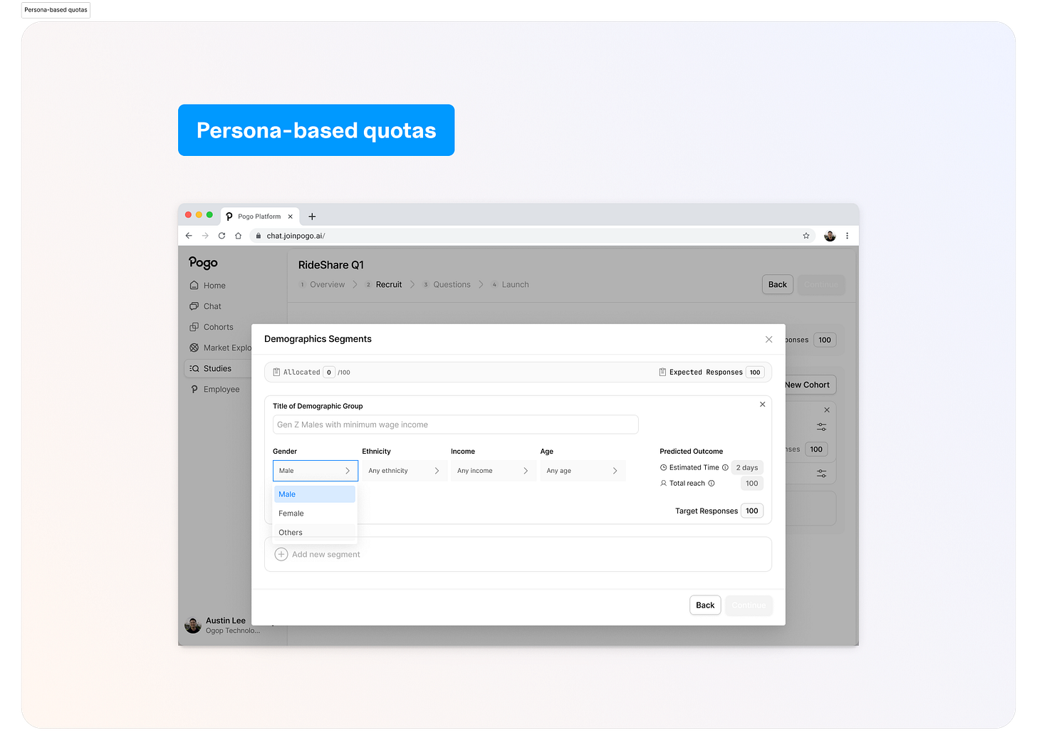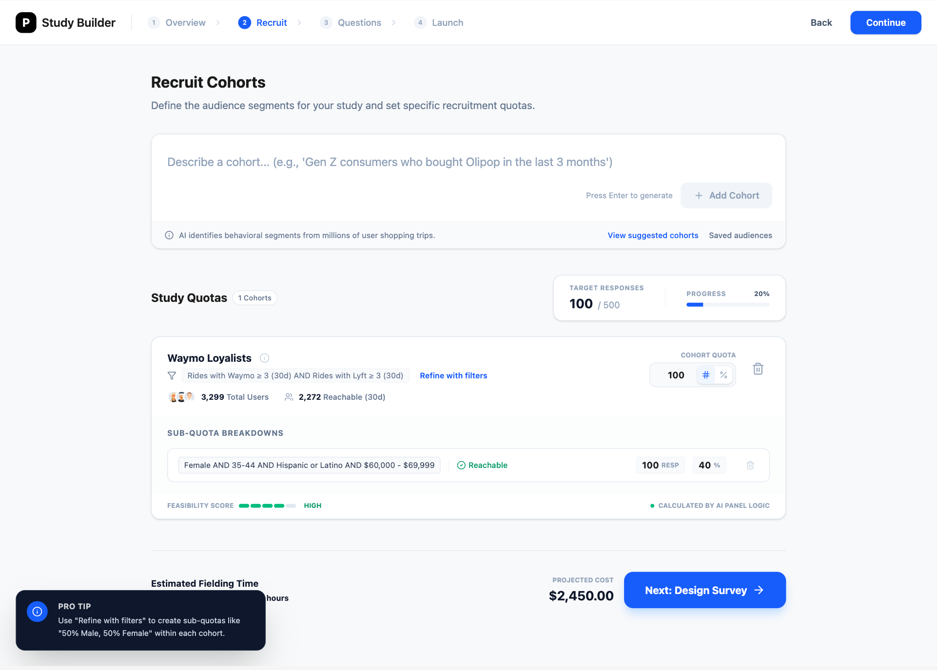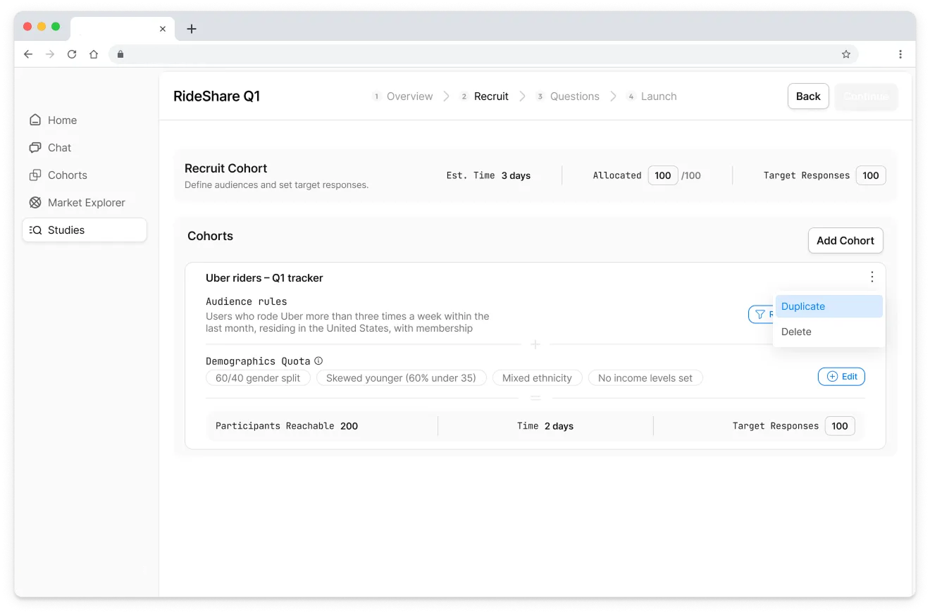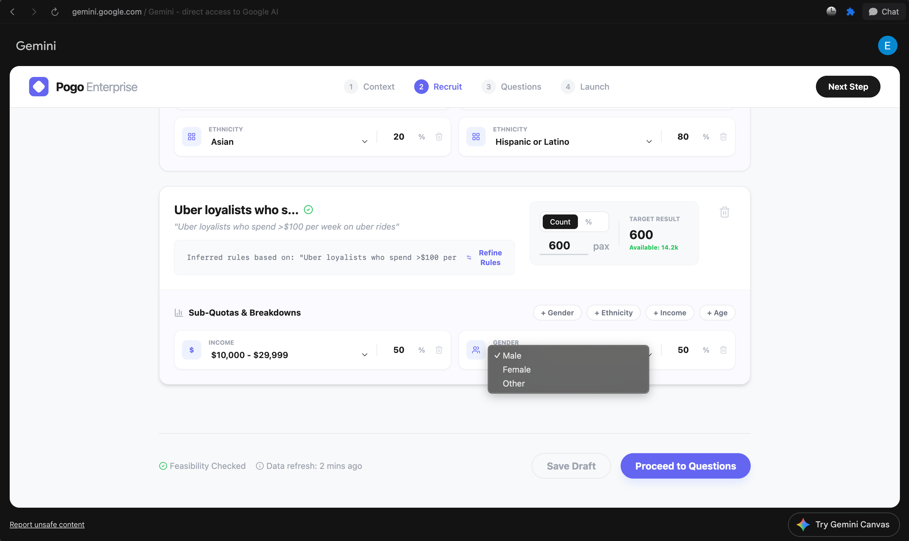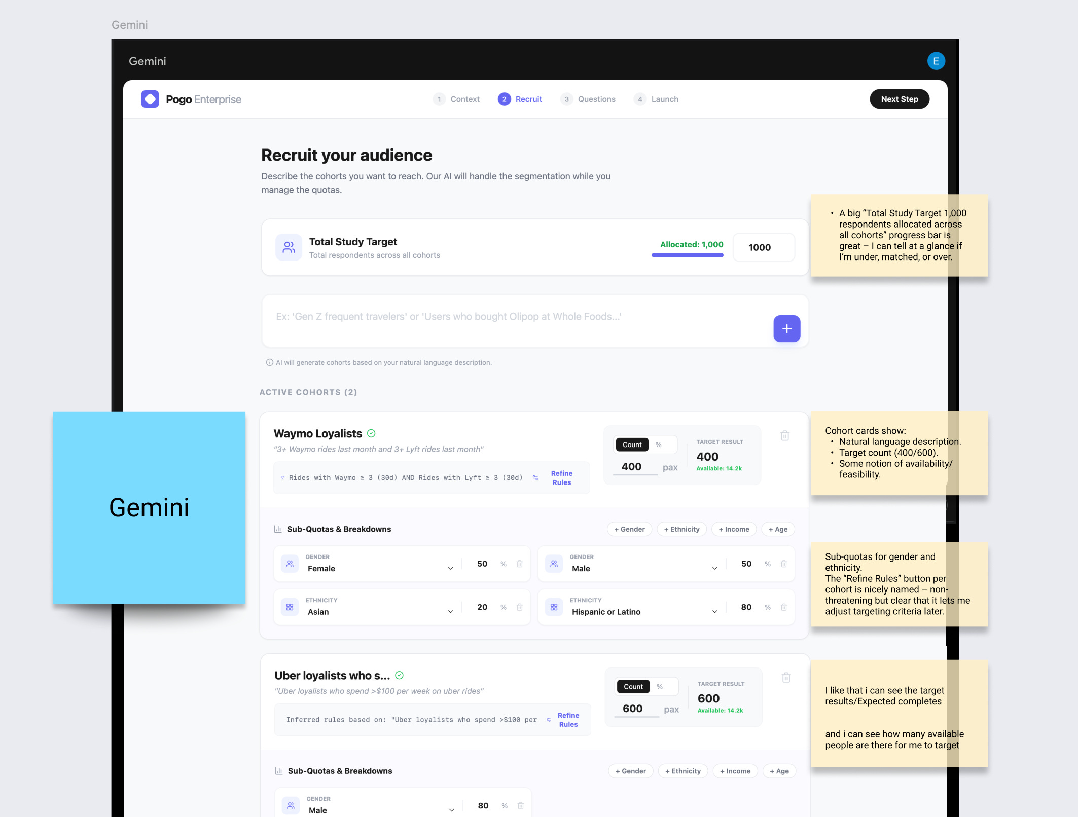 “Oh, so when Alex sets 60 Uber / 30 Lyft / 10 Waymo, that’s at the cohort level. And if he wants 50/50 gender in each, he does that inside each cohort as sub‑quotas. Any leftover unassigned responses get auto‑allocated from eligible participants. Is that correct?”