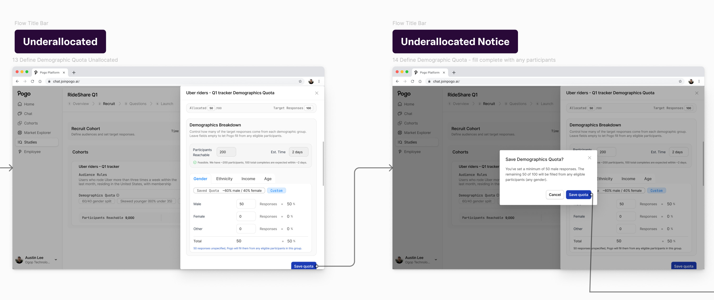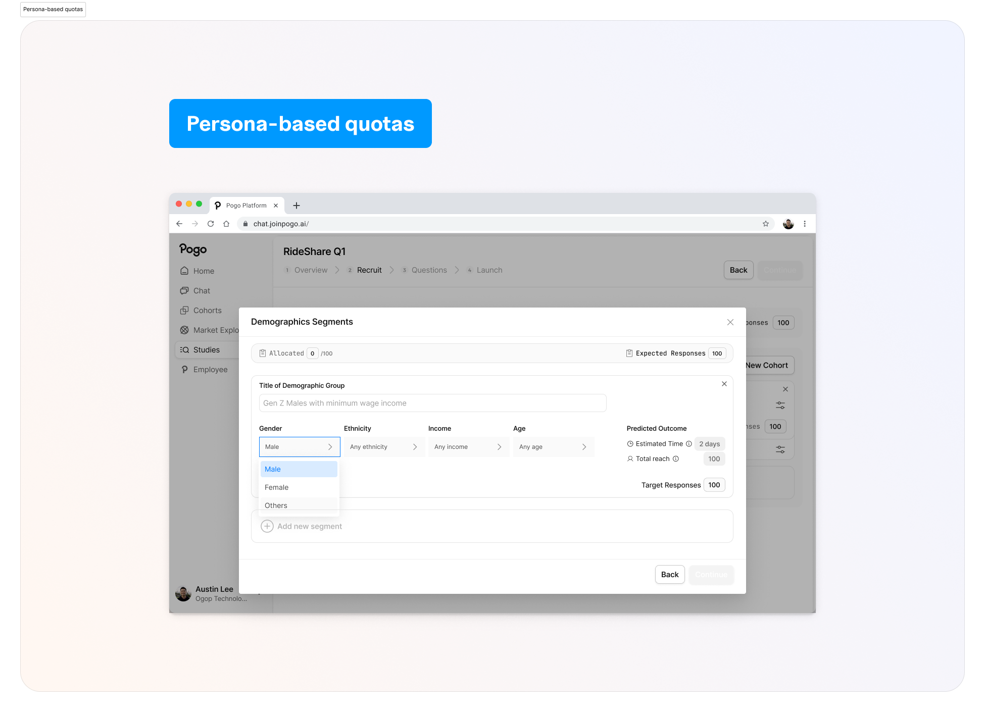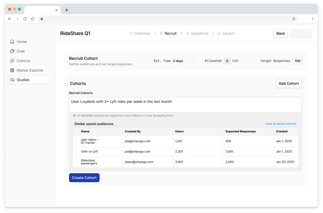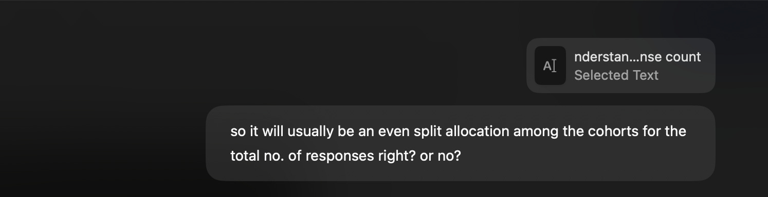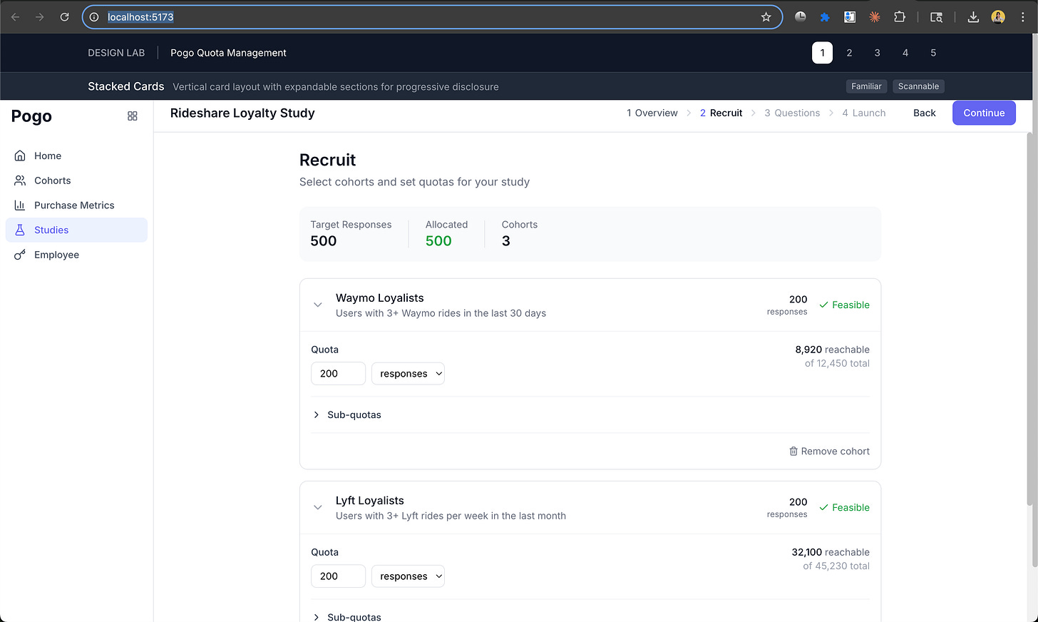 “Oh, so when Alex sets 60 Uber / 30 Lyft / 10 Waymo, that’s at the cohort level. And if he wants 50/50 gender in each, he does that inside each cohort as sub‑quotas. Any leftover unassigned responses get auto‑allocated from eligible participants. Is that correct?”