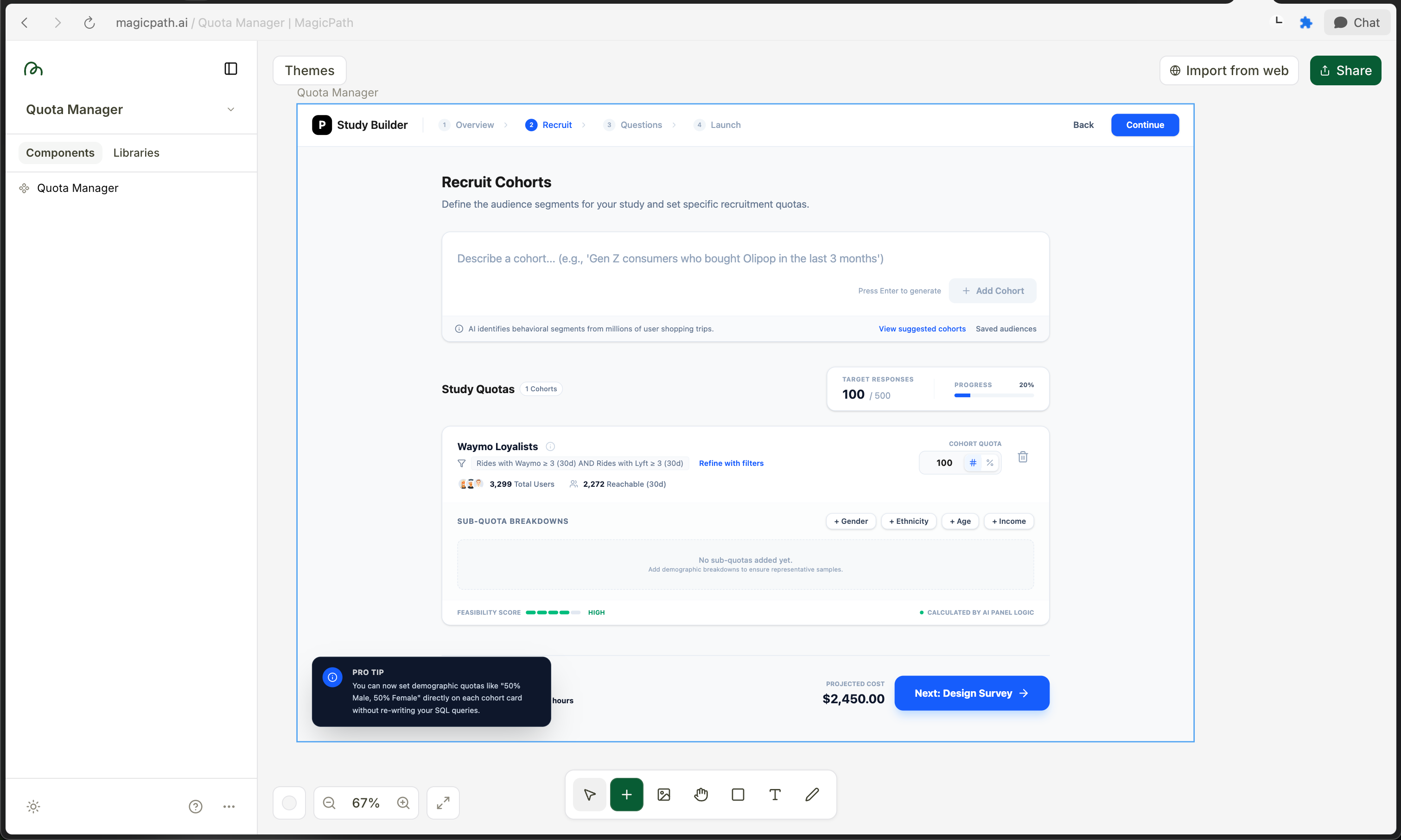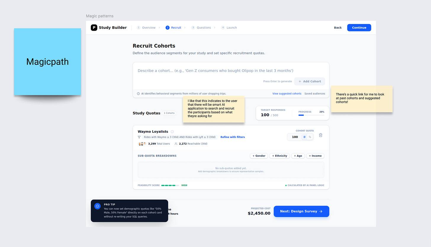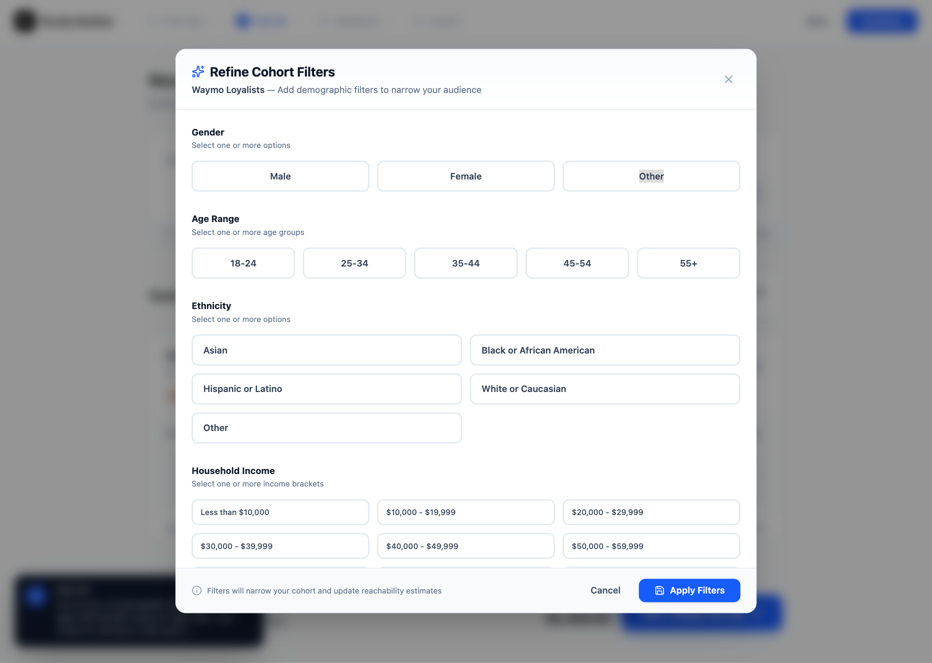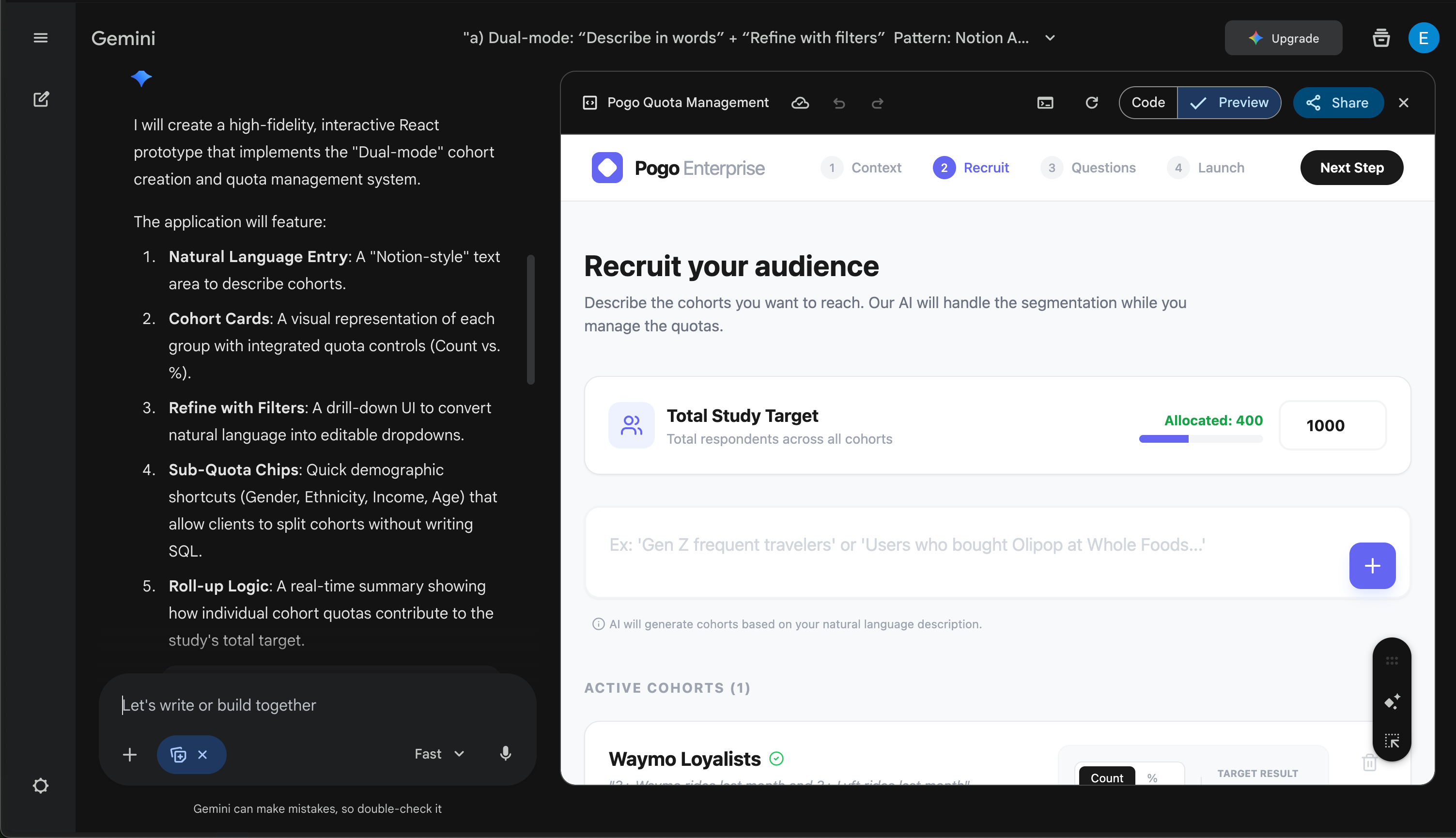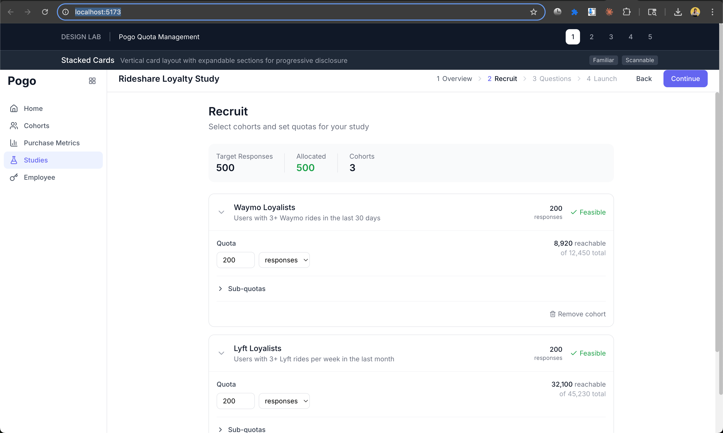 “Oh, so when Alex sets 60 Uber / 30 Lyft / 10 Waymo, that’s at the cohort level. And if he wants 50/50 gender in each, he does that inside each cohort as sub‑quotas. Any leftover unassigned responses get auto‑allocated from eligible participants. Is that correct?”