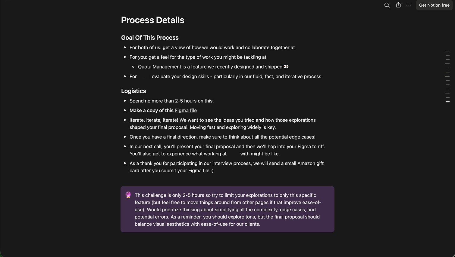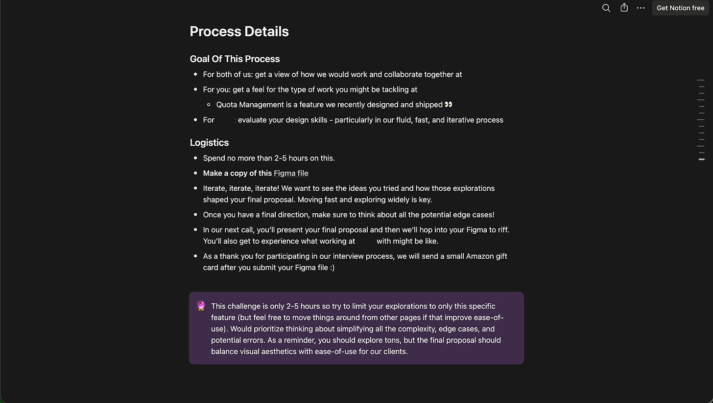 Try it out: Practice these on any public take‑home briefs, run it through your favorite AI tools, and design your own quota management flow. Here’s one that I found