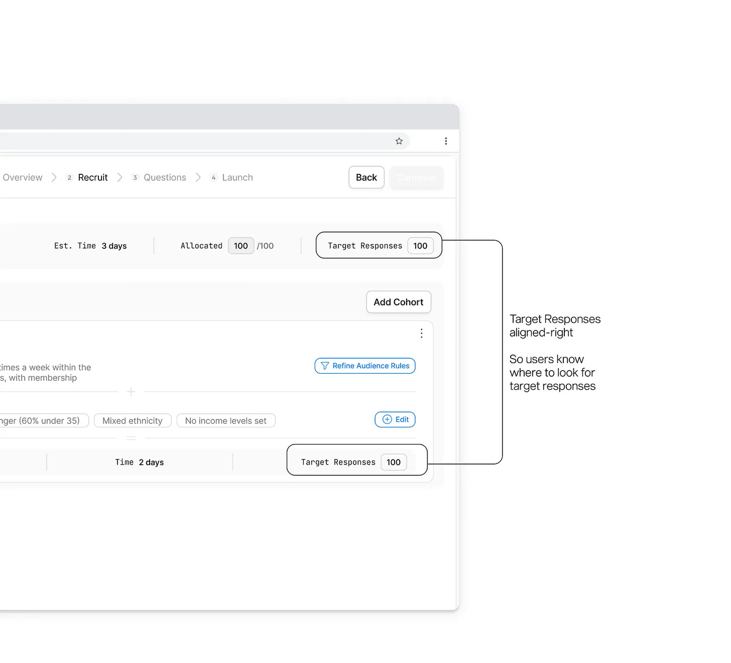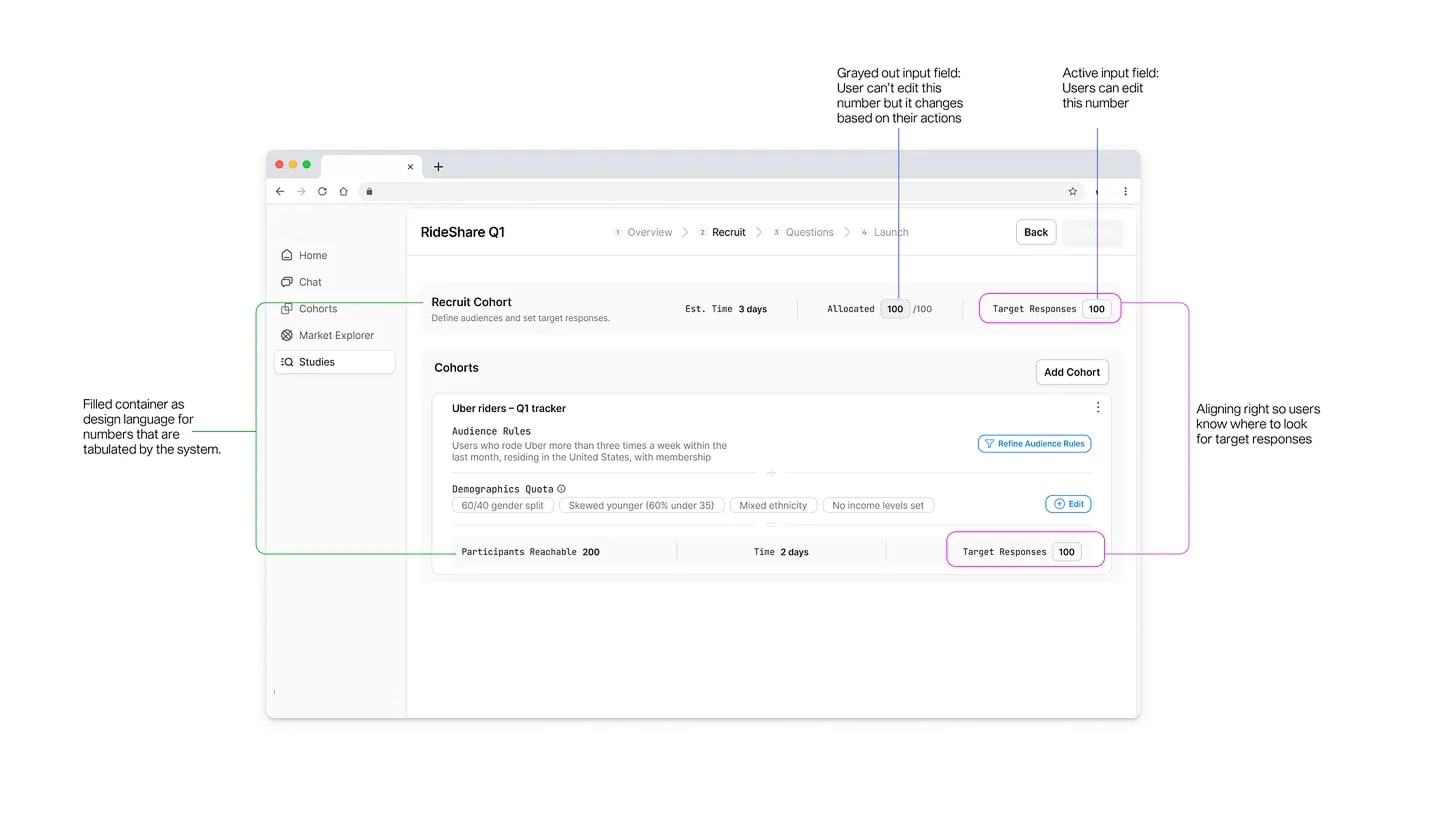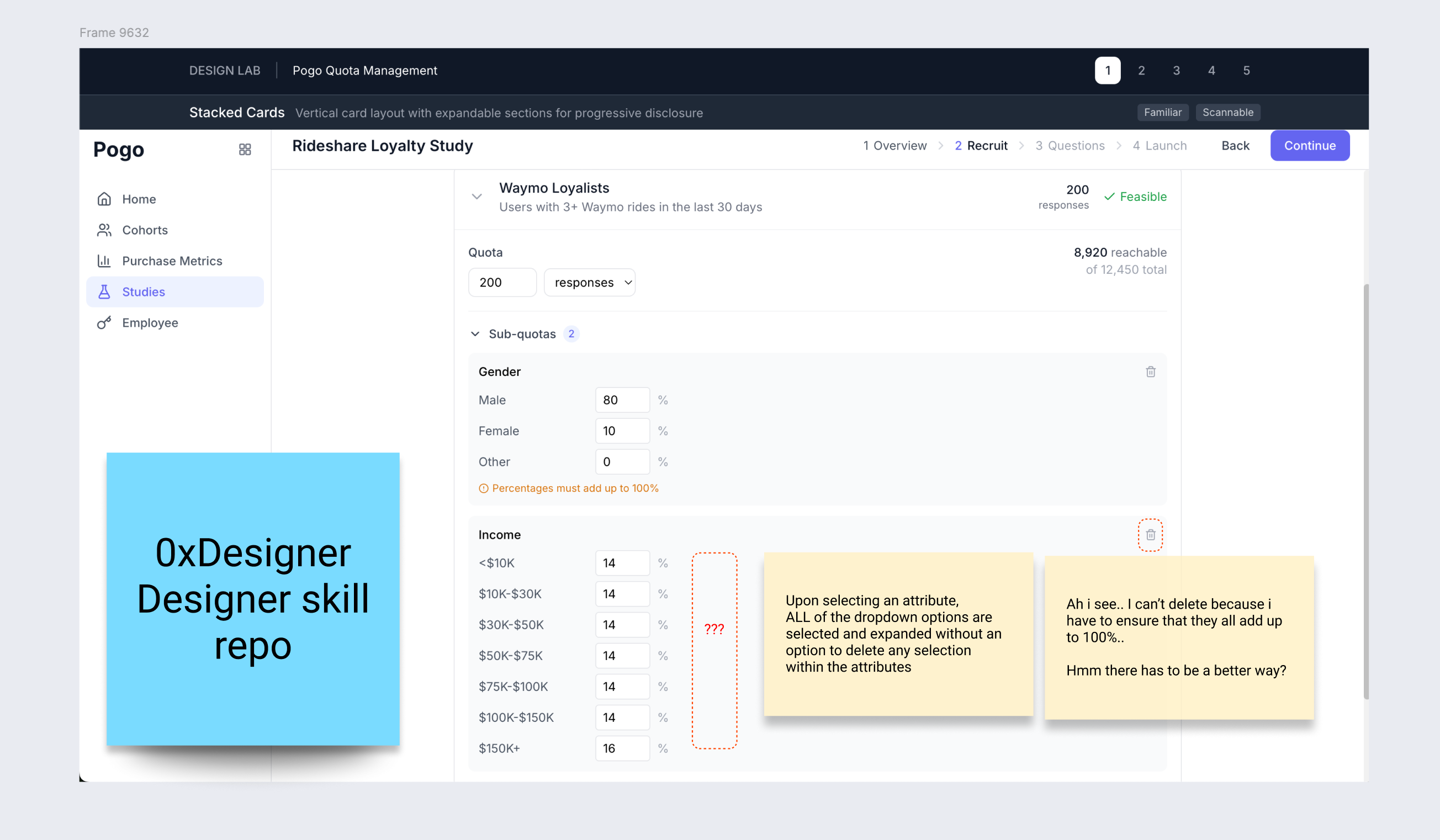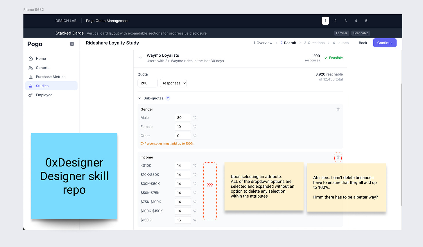 Typically in a real design process, I would form some sort of alignment with the team to ensure we’re on the same page on the opinions we have on how we want to serve the customers. For example: I definitely don’t think making users do the math on a user research web app is the ideal ux.