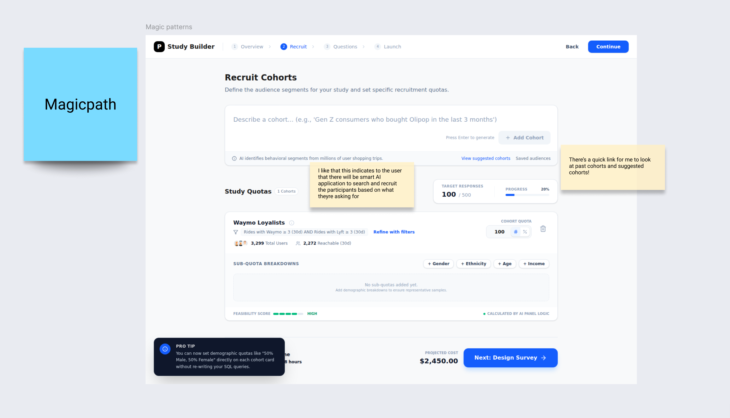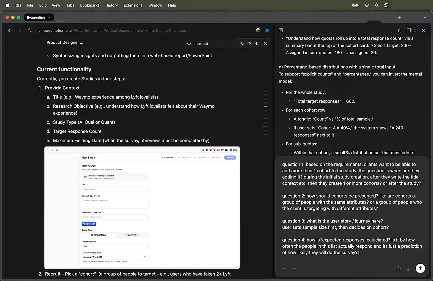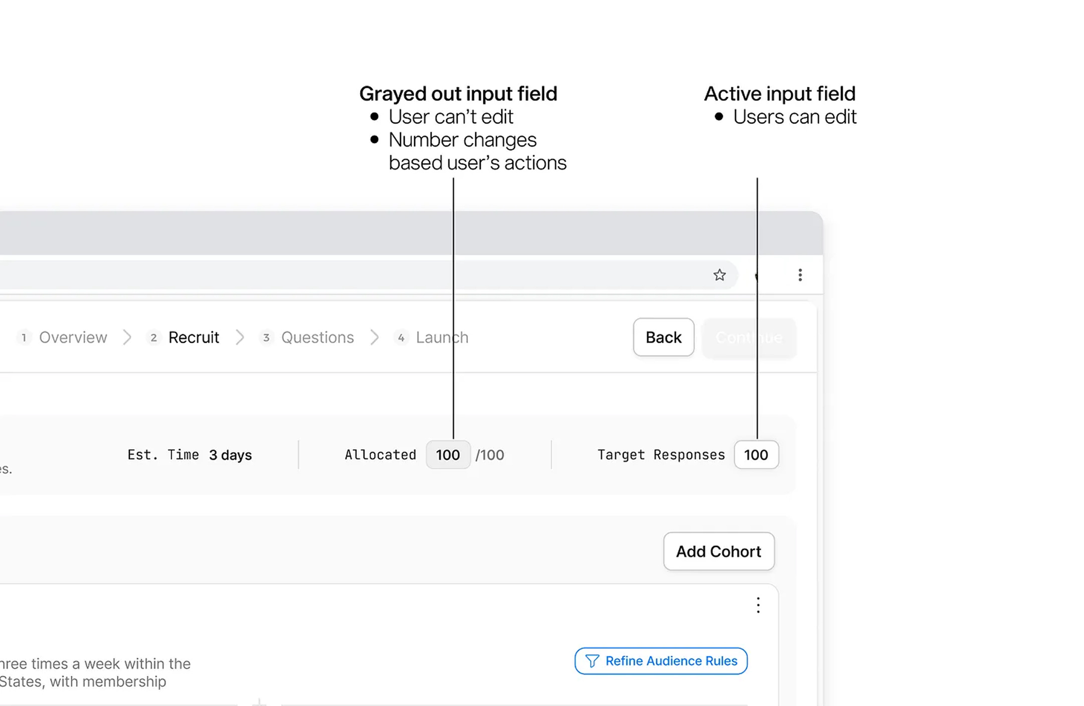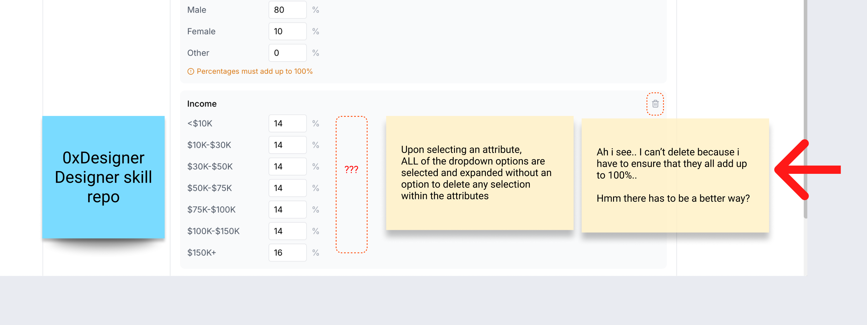 Typically in a real design process, I would form some sort of alignment with the team to ensure we’re on the same page on the opinions we have on how we want to serve the customers. For example: I definitely don’t think making users do the math on a user research web app is the ideal ux.