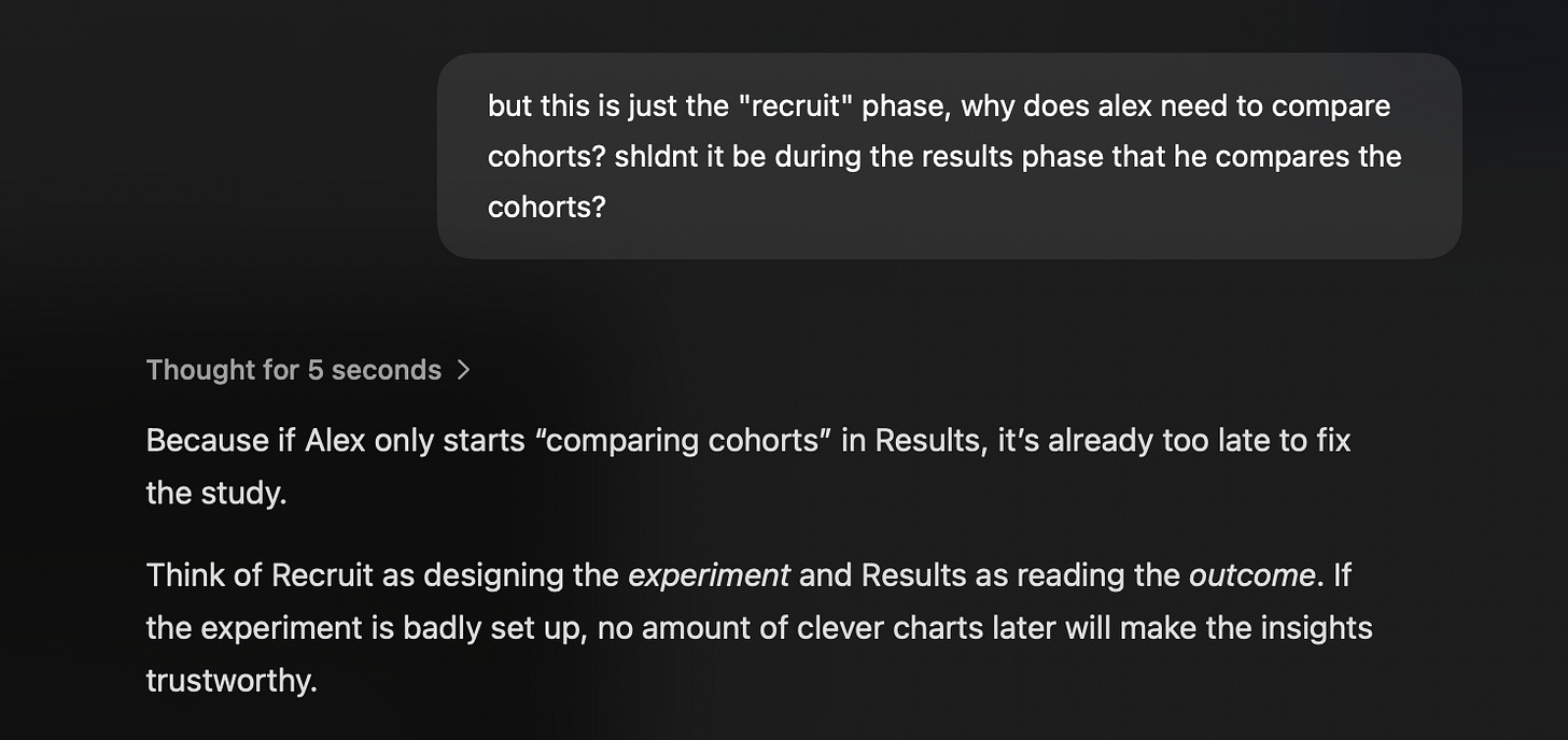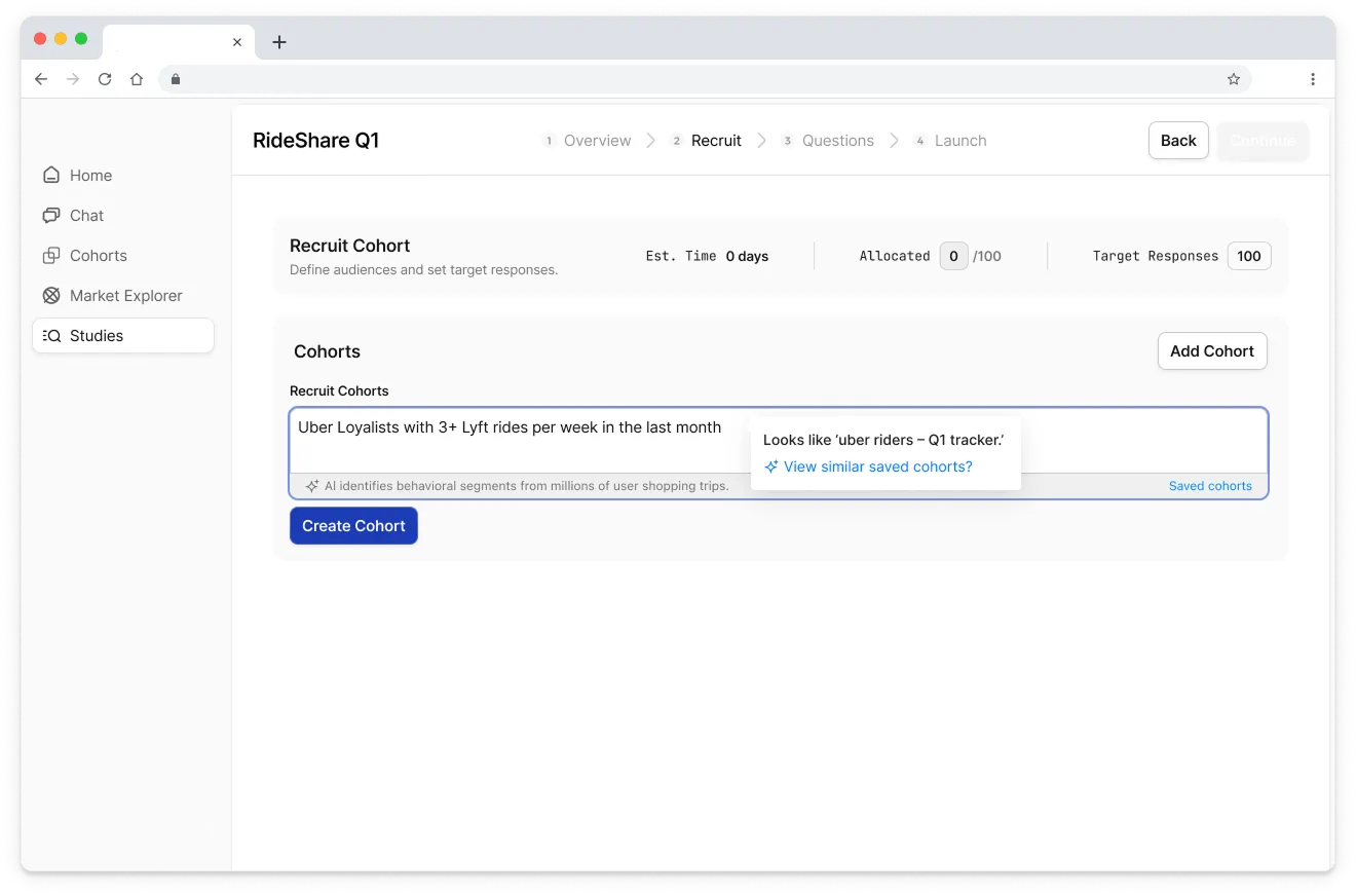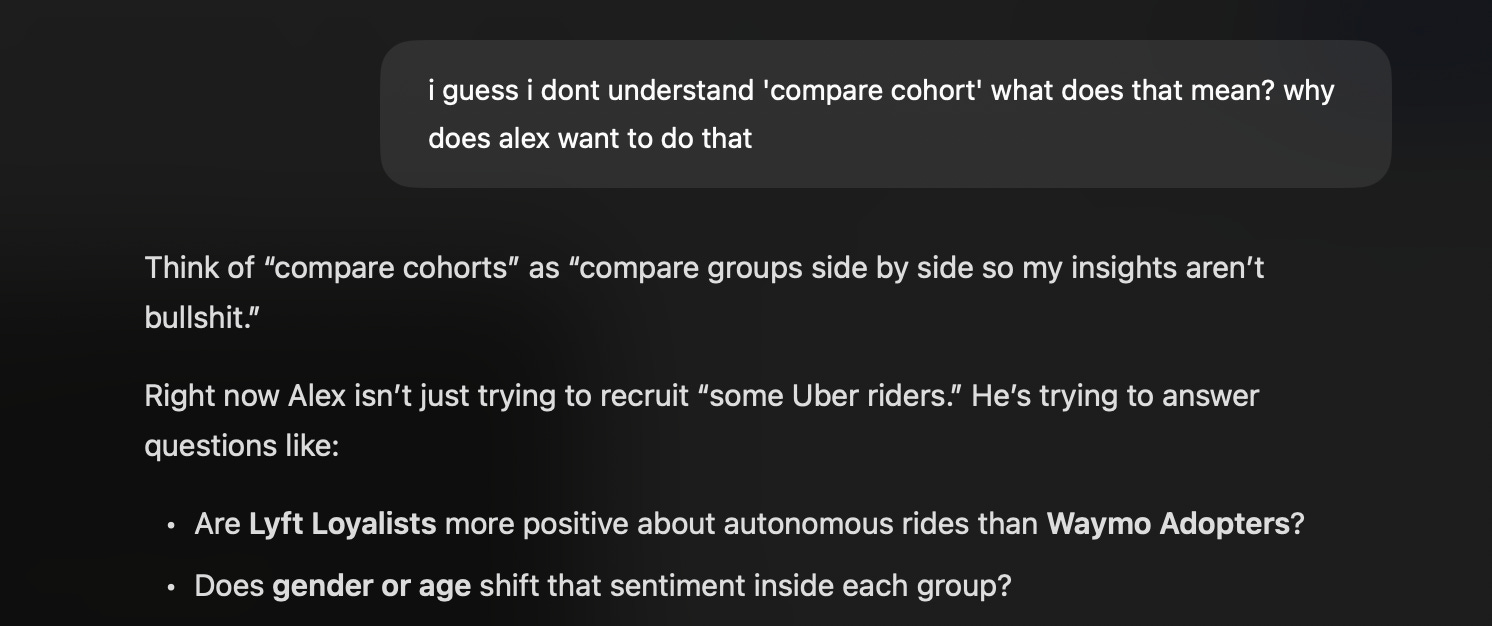 generate realistic scenarios: “Alex wants to compare Uber and Lyft loyalists with similar income and age distributions but slightly different ride frequency. What questions does he ask in the Recruit step?”